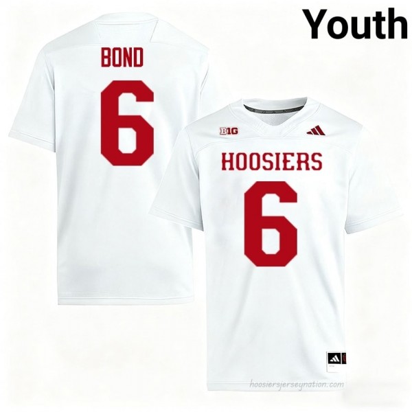 Wear Your Hoosiers Heart on Your Chest: #6 LeBron Bond Hoosiers Jersey | Youth White College Stitched Foottball Collection 95465113! Made with premium, breathable materials, this jersey is perfect for cheering on IU from kickoff to the final whistle. It features bold team colors, LeBron Bond's number, and official logos, capturing the spirit of Hoosiers football. Free shipping on orders, order today and represent with pride!